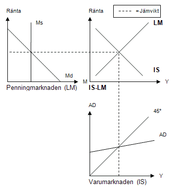 *Y = BNP *M = Pengar *Ms = Utbud av pengar, bestämt av riksbanken *Md = Efterfrågan av pengar, beroende av varumarknaden *AD = Aggregerad efterfrågan