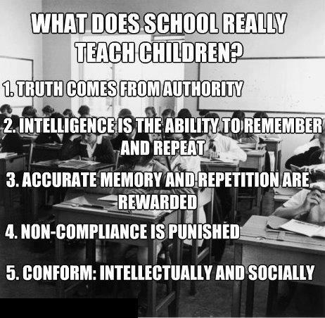 Skolan var inte någon slags social laboratorietjänst eller ännu värre barnpassningstjänst. Vi var i skolan för att lära oss saker, och om vi arbetade hårt, det gjorde vi, ibland i alla fall. Lärarna visste hur man undervisar. Läroböckerna var tillräckliga. Huruvida böcker var nya eller gamla spelade ingen roll. Barnen hade inte lärt sig att vara offer för att behöva läsa begagnade böcker.