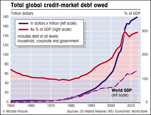 Den ena är ett diagram över exponentiell tillväxt och den andra är på den globala skuldtillväxten.