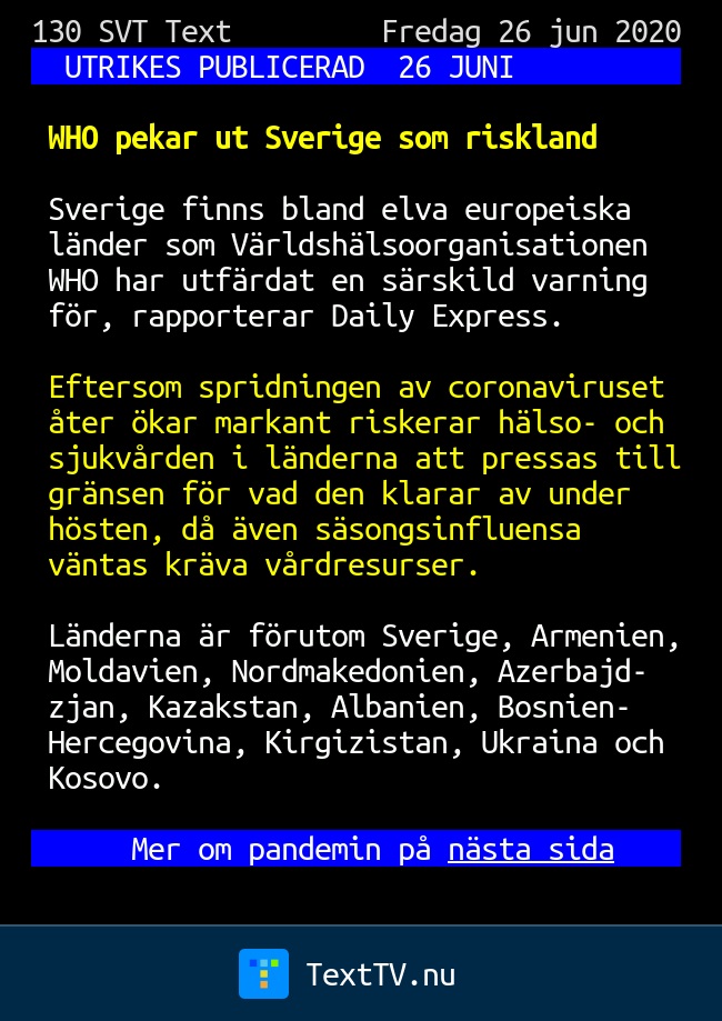 UTRIKES PUBLICERAD 26 JUNI WHO pekar ut Sverige som riskland Sverige finns bland elva europeiska länder som Världshälsoorganisationen WHO har utfärdat en särskild varning för, rapporterar Daily Expres