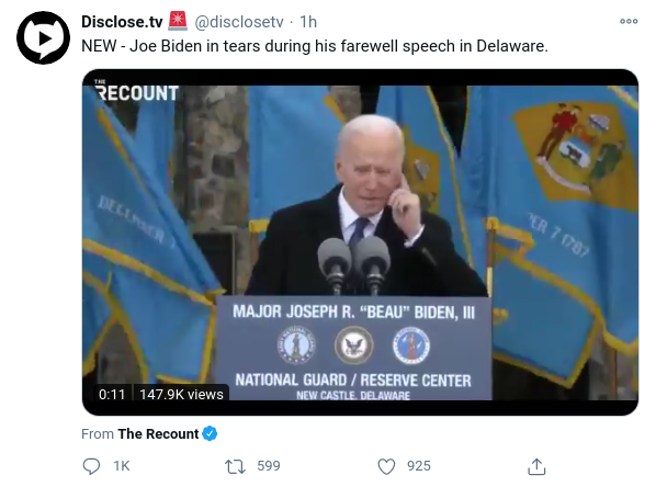 “NEW - Joe Biden in tears during his farewell speech in Delaware. https://t.co/Nml9kkrQYH”
