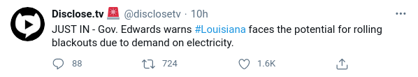 “JUST IN - Gov. Edwards warns #Louisiana faces the potential for rolling blackouts due to demand on electricity.”