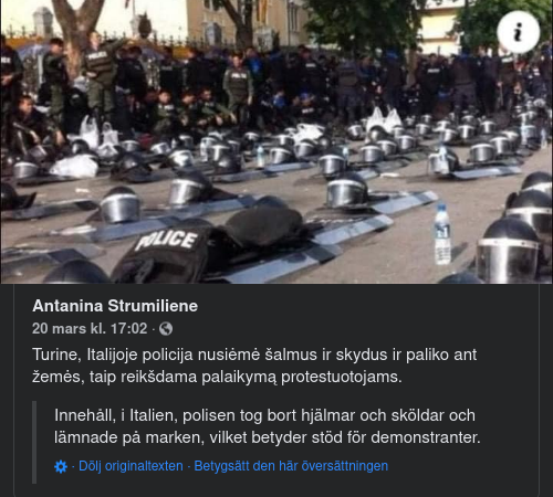 Innehåll, i Italien, polisen tog bort hjälmar och sköldar och lämnade på marken, vilket betyder stöd för demonstranter.