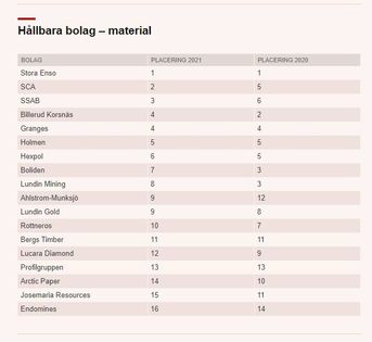 Rankningen Hållbara bolag som publiceras i samarbete mellan Dagens industri och systertidningen Aktuell Hållbarhet omfattar 133 börsbolag inom kapitalvaror, konsumtionsvaror, material, dagligvaror samt banker och investmentbolag.