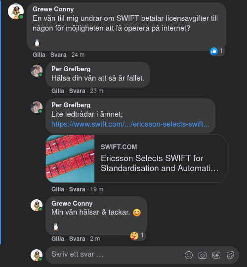 https://www.swift.com/news-events/news/ericsson-selects-swift-standardisation-and-automation?fbclid=IwAR38XseVO2BTv96C2MxmpQmM2ODGxApC3eVcmeqo6InGcfcESvEucaBzsvg