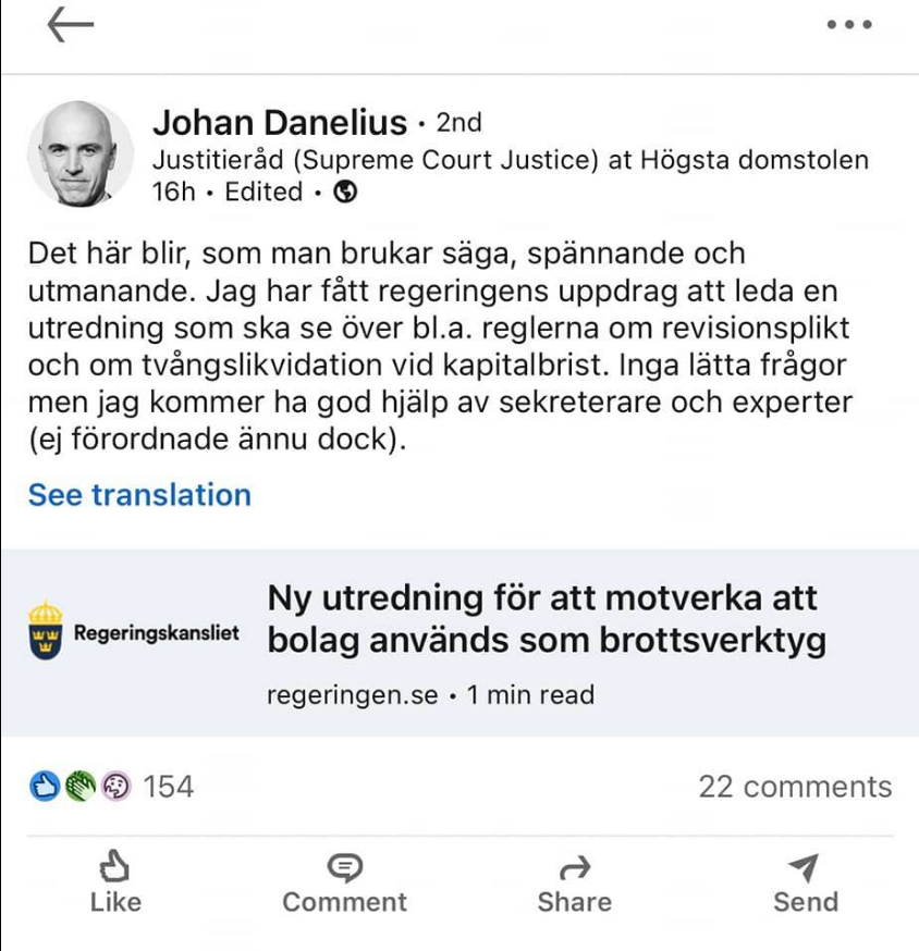 – Brottslighet med koppling till företag medför negativa effekter både för näringslivet och för övriga samhället. Det kan handla om att kriminella grupper använder sig av falska identiteter eller bulvaner för att tvätta pengar genom bolag. Regeringen tillsätter nu en utredning för att motverka att företag används i brottsligt syfte, och därmed verka för att företag drivs på lika villkor, säger justitie- och inrikesminister Morgan Johansson.