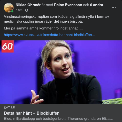 • Avslöjandet 2015 får medicinreportern John Carreyrou ett tips, börjar gräva och bekräftar misstanken: Blodproverna är en bluff. Apparaterna som visas upp för investerare fungerar i själva verket inte. Instrument från andra företag används istället och resultaten som visas upp är förinspelade.