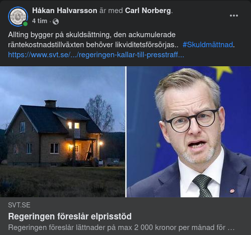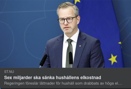 "På senare tid har flera oppositionspartier bjudit över varandra med förslag om hur man ska lätta den ekonomiska bördan på hushållen för de höga elpriserna som har skenat under hösten och vintern. Bland annat har Moderaterna och Liberalerna förslagit att elskatten slopas tillfälligt respektive sänkas. Vanliga hushålls extrema elräkningar har samtidigt skapat rubriker i media.