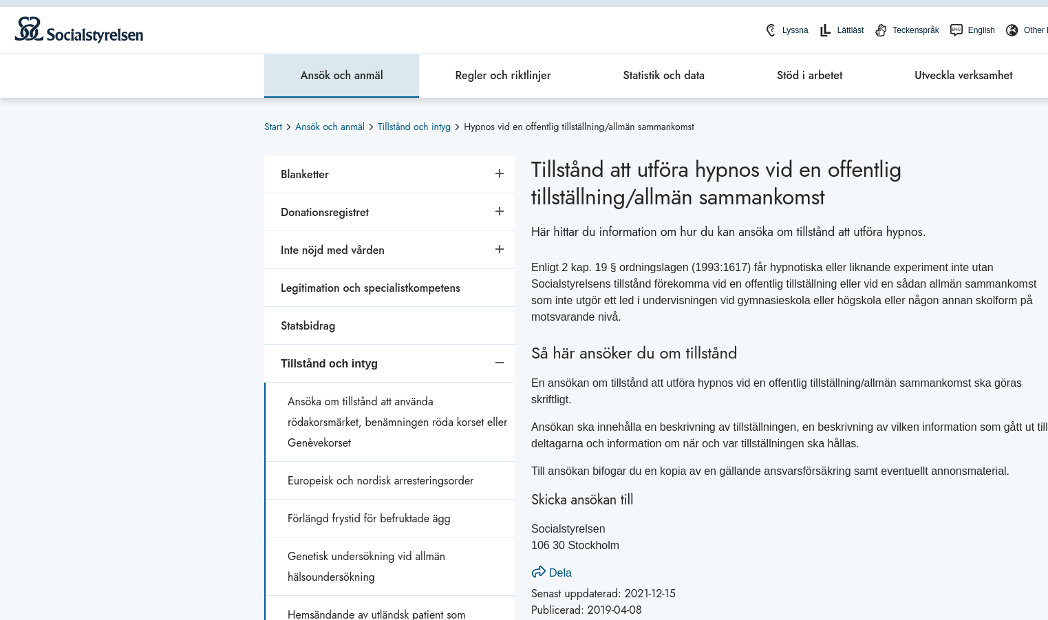 https://www.socialstyrelsen.se/ansok-och-anmal/tillstand-och-intyg/hypnos-vid-en-offentlig-tillstallningallman-sammankomst/?fbclid=IwAR3cNuaG2sghNeFYF1LMBp1o_FCk_pu9HaWbZHRARjPiDDDab1GESfe9sAc