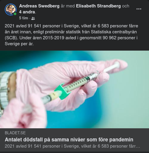 Antalet dödsfall har sedan mitten av 70-talet legat kring 90 000 döda per år med några undantag. 2020 är ett av de undantagen då 98 124 personer avled i Sverige. Tittar man på antalet döda per 1 000 invånare var siffran den högsta sedan 2012. Även om antalet dödsfall sjönk i fjol sticker en månad ut i statistiken. Enligt preliminära siffror avled 10 181 personer under januari månad 2021. Sett till hela 2000-talet är det bara i april och december 2020 som det har dött fler personer under en enskild månad. ”Under resten av 2021 låg dödsfallen på en normal till låg nivå. Särskilt få döda var det under perioden mars till juli”, säger Tomas Johansson. Redaktionen https://bladet.se/nyheter/antalet-dodsfall-pa-samma-nivaer-som-fore-pandemin/?fbclid=IwAR1UZ3zNlKR0LhAe8k-0kAM-Az21bGETmp3SnF5GoNi9IsZTnjsKatKqaQc