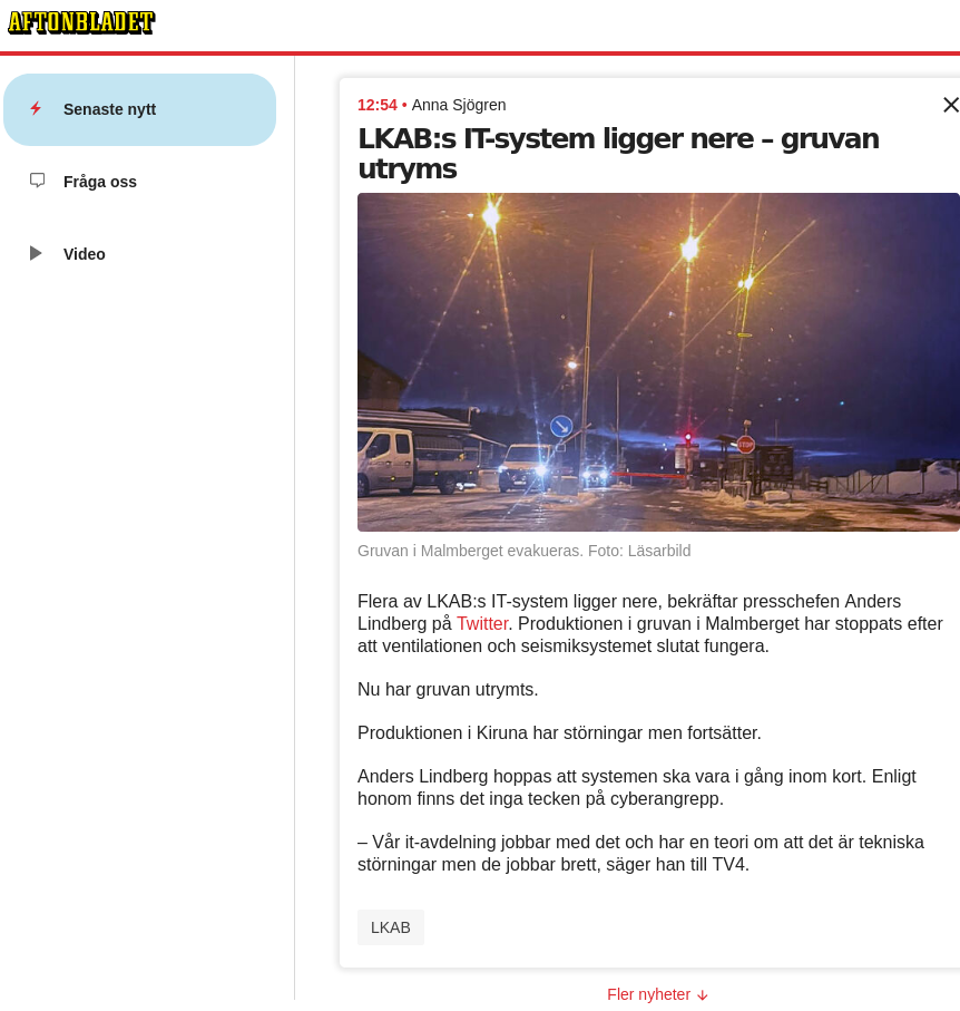 https://live.aftonbladet.se/supernytt/news/lkabs-it-system-ligger-nere.ecZ-eiC8T?fbclid=IwAR0XsoWRYnhH6UoPKCHTas8G7uLdo1gd5P_vkvWNJwWo62tjTfgx8bOtVfY Malmbergsgruvan utryms eftersom flera av LKAB:s kritiska system ligger nere, rapporterar SVT och TV4. Nu måste personalen lämna gruvan eftersom exempelvis ventilationssystemet inte kan övervakas. Företagets presschef Anders Lindberg skriver på Twitter att orsaken är okänd. Till TV4 säger han att ingenting tyder i nuläget på ett externt cyberangrepp.