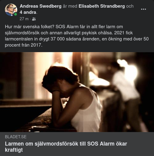 Andreas Swedberg- https://bladet.se/nyheter/larmen-om-sjalvmordsforsok-till-sos-alarm-okar-kraftigt/?fbclid=IwAR1o6o9UUVVpnN18_FblTCdzmcPFyQYs0ImkcICpg4Mhime8e21fF96qek8