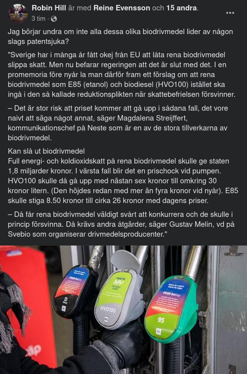 En stor prishöjning skulle inte bara drabba dem som upptäckt att man kan tanka miljövänligt i sin gamla dieselbil, utan även många budfirmor, bussbolag och åkerier som kör “fossilfritt” eller klimatvänligt och tankar etanol eller HVO100. Det är ibland ett krav i upphandling.