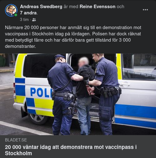 Redaktionen https://bladet.se/nyheter/20-000-vantar-idag-att-demonstrera-mot-vaccinpass-i-stockholm/?fbclid=IwAR3AnKDRJ6pvvWTYYHmBYBf9xDyWsGrl0Lc6dQ2bqZlVCLvQvSX7HgeRies
