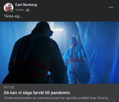 – Efter det kommer smittan att sjunka nästan lika fort som den kom. Och då kan vi nog säga farväl till pandemin, så länge det inte uppstår en ny variant som helt ändrar spelreglerna. Men tyvärr har ju det hänt två gånger redan och det är möjligt att det kan hända igen. Osvuret är bäst på grund av det.