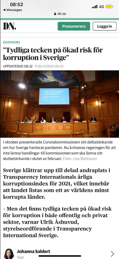 Samtidigt varnar organisationen för en ökad risk för korruption i både offentlig och privat sektor i Sverige. Coronakommissionen och misstankar om mutbrott mellan Vårdexpressen och tjänstemän i Region Skåne är två exempel. Att svenska storbolag som Ericsson och Telia dessutom finns i USA:s topp-tio-lista över utdömda sanktioner från amerikanska myndigheter och att svenska banker brister i sitt penningtvättsarbete är två ytterligare.