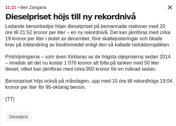 https://live.aftonbladet.se/supernytt/news/dieselpriset-hoejs-till-ny-rekordnivaa.eSXebrqHf?fbclid=IwAR3h77-xSkhJUrJC5SRMcKhF_iW4LNcFl83YTAjxoL8tLcLIfVr7Krl_jHc