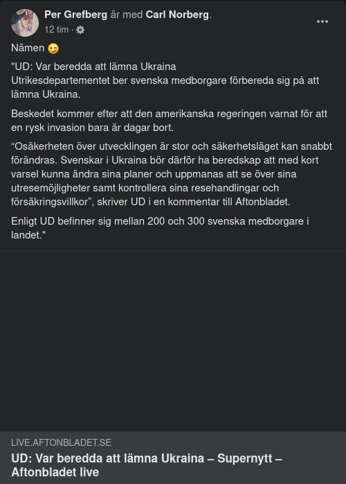 "Beskedet kommer efter att den amerikanska regeringen varnat för att en rysk invasion bara är dagar bort."
