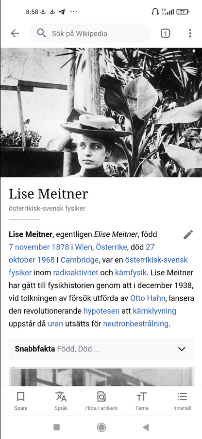 Lise Meitner som var kvinnan bakom mekanismen till fission genom att splittra uran, flydde alltså undan nazisterna och "råkade" hamna i Ljungaverk. Hon hade dessutom en vän, Eva von Bahr, som var systerdotter till den tidigare svenska statsministern Erik Boström.
