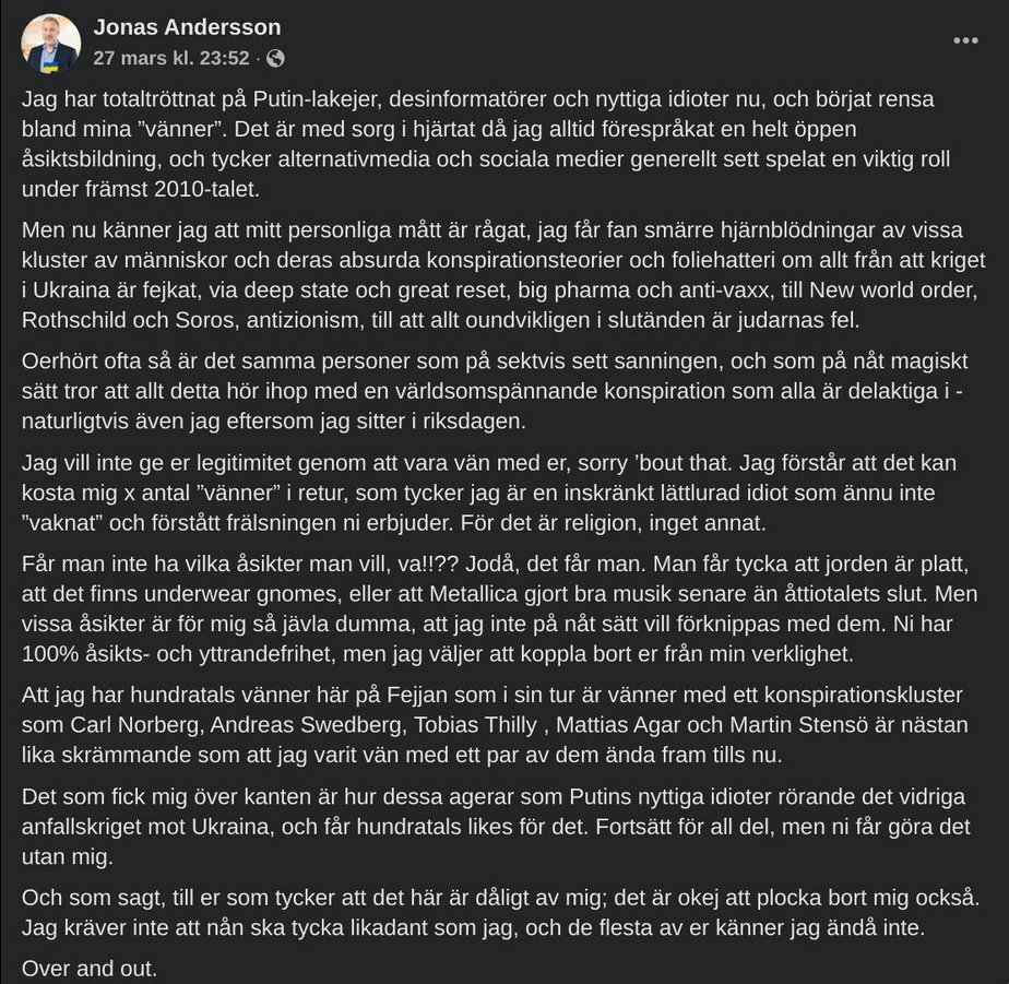 Hej Jonas, Tills för ett par timmar sen var du för mig okänd, men du kände tydligen till mig. Varför du valde att omnämna mig i ditt inlägg är för mig en gåta, jag utgår från att vi varit vänner på FB tidigare men jag nu är en av de du plockat bort, där jag i så fall närmast kan garantera att vänförfrågan kom från dig till mig och inte tvärtom - jag är ganska selektiv med vilka vänförfrågningar jag skickar. Det kanske du också borde vara om saker som går emot din världsbild upprör dig? Jag kan inte påminna mig att du en enda gång initierat en diskussion med mig innan du fick den briljanta idén att som representant för Sveriges Riksdag hänga ut mig inför dina 16000+ vänner och följare. De flesta håller nog med om att det minsta man kan begära av en representant av Sveriges Riksdag är att de åtminstone en gång diskuterar med vederbörande innan man hänger ut dem - om nu våra politiker bör syssla med att hänga ut enskilda över huvud taget. Du uttrycker att du "alltid förespråkat en helt öppen åsiktsbildning" men att du "känner att ditt personliga mått är rågat". Här borde det i varje tänkande individ ringa en varningsklocka som uppmanar till självreflektion. Vad exakt är det som gör att man går ifrån att förespråka en öppen åsiktsbildning? Vilken människa har rätten att avgöra vilka åsiktsskildringar som är tillåtna eller ej, och på vilka grunder? Kommunikation är vägen framåt och klarar man inte av det gör man smart i att sitta still i båten och tänka efter tills dess att man gör det. Noterar den fullständiga avsaknaden av argument i sak i ditt inlägg. Det är tråkigt att se en representant för befolkningen hänge sig åt polarisering som du gör, tyvärr är jag inte det minsta förvånad över att se ett sådant beteende från en part-i-politiker. Alla är fria att tro på vad de vill, men att klistra nedsättande epitet på människor är ingenting annat än polarisering och är ej till gagn för någon annan än de som söker härska genom söndring - något jag inte tror du kan förneka skett åtskilliga gånger genom historien och som borde ligga i alla människors intresse att undvika. Du skall dock ha tack, det gav mig möjligheten att visa vilken typ av ledare vi inte behöver i det här samhället. När verkligheten kommer ikapp dig är du välkommen att höra av dig, i min värld är det inte så noga att man gör bort sig - det är vad man gör när man inser det som är av vikt. Väl mött. Mattias Agar https://www.facebook.com/Humlannitton/posts/10225501591760239
