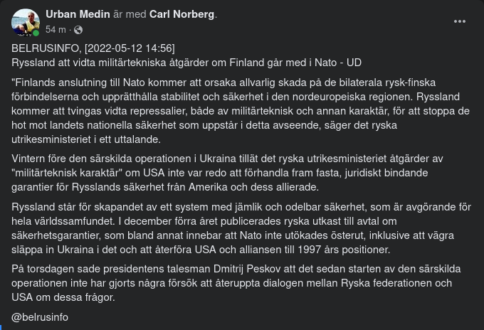 – Natomedlemskapet kommer att stärka säkerheten i både Finland och Nato, säger han i en uttalande.Ett finskt Natomedlemskap är definitivt ett hot mot Ryssland, säger Kreml.