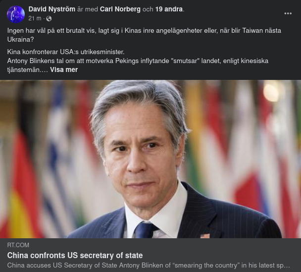 Tidigare denna månad anklagade Taipei Peking för att flyga 18 militärflygplan, inklusive två kärnvapenkapabla bombplan, in i dess luftförsvarszon. Blinken uppgav att dessa handlingar var "djupt destabiliserande" och hotade freden och stabiliteten i Taiwansundet.
