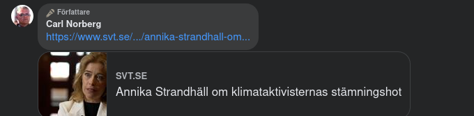 https://www.svt.se/nyheter/inrikes/annika-strandhall-om-klimataktivisternas-stamningshot?fbclid=IwAR0GMWa949j7ZMzO1IdWUsfd3ziv2uVpICWnJhSQZukVfj47ykXu79CYbSo