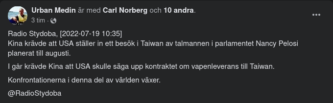 Hur var det nu med olika territorium? Påminner Taiwan kanske lite om Ukraina? Kan detta hänga ihop med att ett fåtal svenska individer sedan länge lagt sig i Kinas inre angelägenheter?
