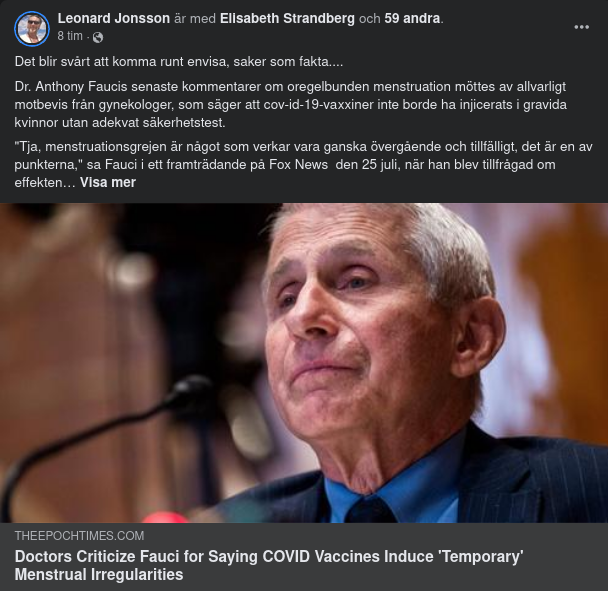 "Tja, menstruationsgrejen är något som verkar vara ganska övergående och tillfälligt, det är en av punkterna," sa Fauci i ett framträdande på Fox News den 25 juli, när han blev tillfrågad om effekten av vacciner på menstruationscyklerna.