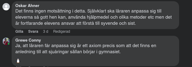 Det finns en anledning till att få sjuåringar börjar på gymnasiet och dessutom är det knappast upp till eleven att tala om för läraren hur och/eller vad som ska läras ut - om nu ens den av eleven utsedde läraren anser sig själv vara en lärare eller inte vilket ju kanske kan vara en detalj värd att notera i det hela.