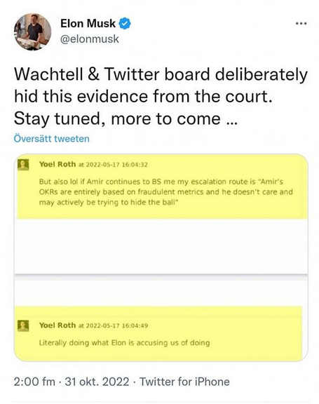 Elon Musk twittrade att Twitter Board och advokatbyrån som arbetade för Twitter, Wachtell, kan ha undanhållit information från honom och domstolen.