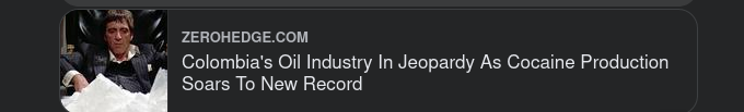 En nyckelindikator på Colombias försämrade inhemska säkerhet är det senaste tillkännagivandet från FN:s kontor för narkotika och brott (UNODC) att den inhemska kokainproduktionen (spanska) slog ännu ett rekord under 2021 . Det skedde trots årtionden av USA-finansierade narkotikabekämpningsoperationer, vilket lämnade Colombia som världens främsta kokainproducent. UNDOC uppskattar att kokainproduktionen 2021 ökade med 14 % år över år till 1 400 ton, medan mängden mark som används för kokaodling ökade med hela 43 % till en halv miljon hektar. Den växande kokainproduktionen, tillsammans med de enorma vinster som narkotikahandeln genererar, var ansvariga för att finansiera den enorma upptrappningen av Colombias asymmetriska flerpartikonflikt under 1980-talet.
