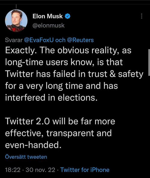 In response to a report from Reuters about Twitter's move to free speech under Musk, he replied that "The obvious reality, as long-time users know, is that Twitter has failed in trust & safety for a very long time and has interfered in elections. Twitter 2.0 will be far more effective, transparent and even-handed."