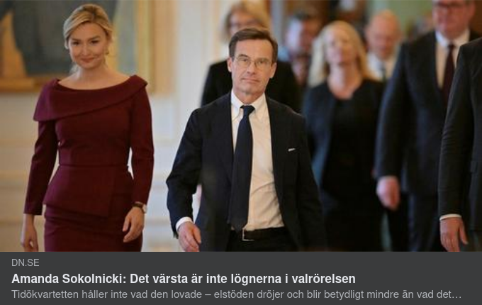 När regeringen anklagas för att ha ljugit för väljarna också om högkostnadsskyddet går Kristersson till motangrepp. Löftet var att komma med ”ett besked” till den 1 november, ingenting annat, säger han. Men man behöver inte gå längre än till partiets egen reklam för att se att det inte stämmer. Stödet skulle vara på plats i november, det var ett ”vallöfte”, underströks det. Då.