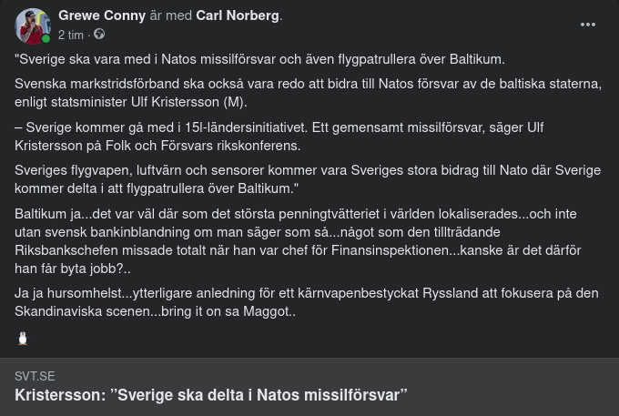 – Det andra handlar om att Sverige avser att med Gripen-plan bidra till incidentberedskapen för Estland, Lettland och Litauen, genom Natos Baltic Air Policing. Vi är också beredda att bidra till Natos Air Policing i Svarta Havet och på Island. Detta är gemensamma åtaganden för alla medlemmar.