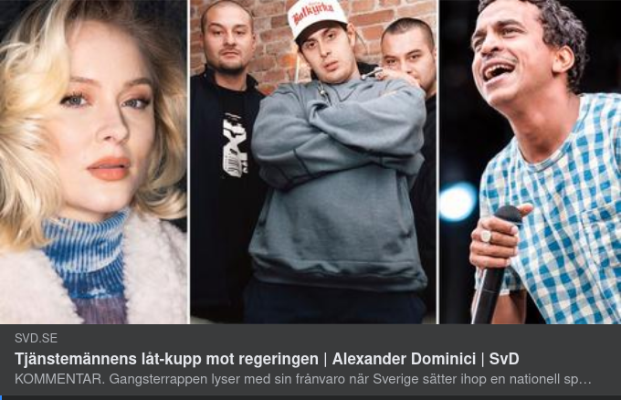 Den svenska listan har kritiserats för att vår mest populära genre, gangsterrappen, inte finns representerad (DN, 5/1). Med tanke på att så många av de svenska rappare som streamat bäst de senaste åren har visat sig ha kopplingar till grov kriminalitet så kanske det inte är så förvånande. Lägger man till det faktum att listan helt saknar megagenren ”epa-dunk”, med hits som ”Rid mig som en dalahäst” så kanske vi kan dra slutsatsen att vissa kulturella yttringar har en bit kvar innan de anses rumsrena i diplomatiska sammanhang.