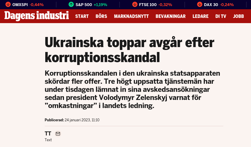 I helgen avgick Vasyl Lozynskyj, biträdande minister vid Ukrainas infrastrukturdepartement, efter anklagelser om att han tagit emot en muta i miljonklassen. Under måndagskvällen sade Volodymyr Zelenskyj i sitt dagliga videotal att fler omkastningar i landets ledning är att vänta.