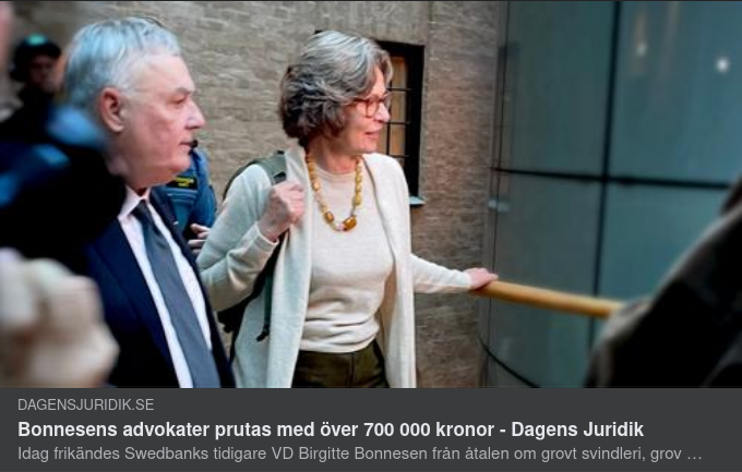" Swedbanks tidigare vd Birgitte Bonnesen frias från anklagelserna om grovt svindleri och röjande av insiderinformation. ”Det är en jättestor framgång för Birgitte Bonnesen att tingsrätten har friat henne på bägge punkterna. Hon är jättelättad”, säger hennes advokat Per E Samuelsson.