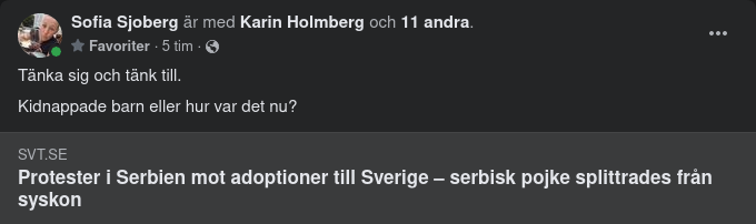 https://www.svt.se/nyheter/granskning/ug/protester-i-serbien-mot-adoptioner-till-sverige-serbisk-pojke-splittrades-fran-syskon?fbclid=IwAR1pdpQhTTubLkDQOTkmdtrzZGL-U49FOaC2IDjHmtMOH7nZ5-61i2PB5AIFrihetens hemlighet ligger i att utbilda människor, medan tyrannins hemlighet är att hålla dem i okunskap.