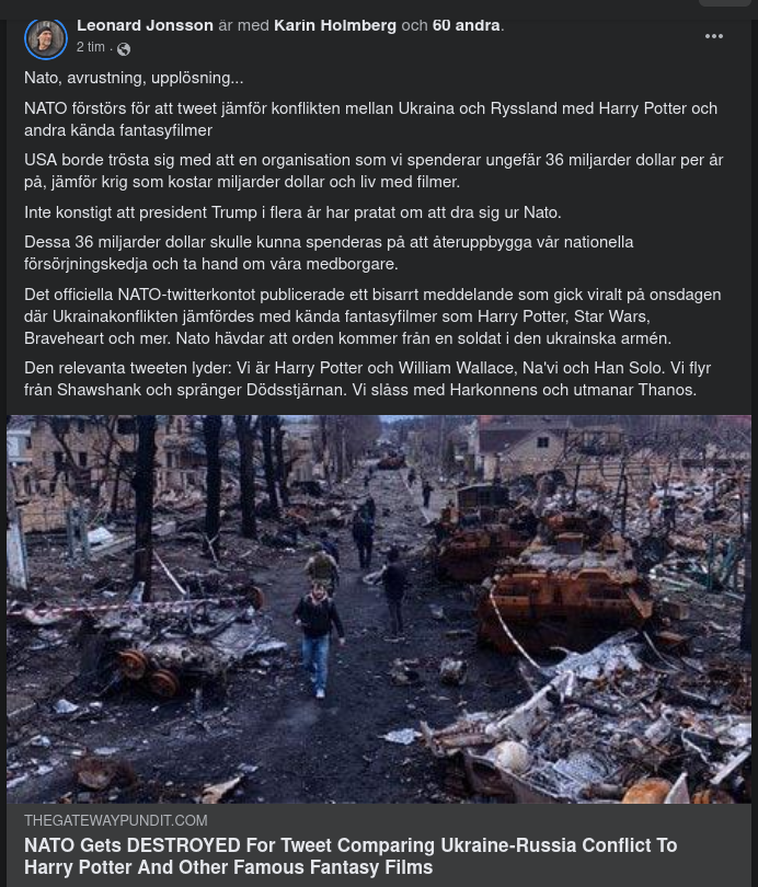 https://www.thegatewaypundit.com/2023/02/nato-gets-destroyed-for-tweet-comparing-ukraine-russia-conflict-to-harry-potter-and-other-famous-fantasy-films-responses-are-hysterical/?fbclid=IwAR0UgrEnZpiPcsdRUj_S6XsZpPeEhGZxwDTSKpPvk12FhYvkJ2JPjA-9IuE