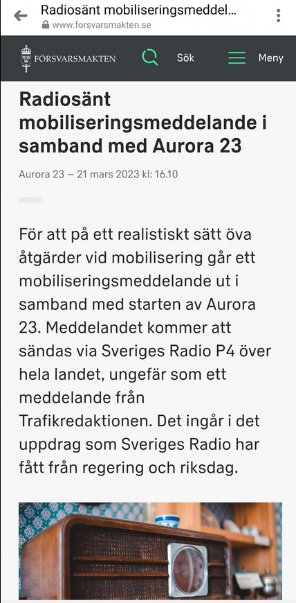 "Detta meddelande är en del av försvarsmaktsövningen Aurora 23. Idag den 24 april, inleds Aurora 23. Du som har fått en inkallelse till krigsförbandsövning (KFÖ) med start den 24 april, ska nu så snart som möjligt inställa dig på den plats som anges i inkallelseordern. Din inkallelseorder gäller, detta är en komplettering. Har du en inkallelseorder med ett annat datum för inryckning, ska du inställa dig den dag som står på inkallelsen. Aurora 23 är en övning och ordern om inställelse gäller endast dig som tidigare har fått en skriftlig inkallelseorder."