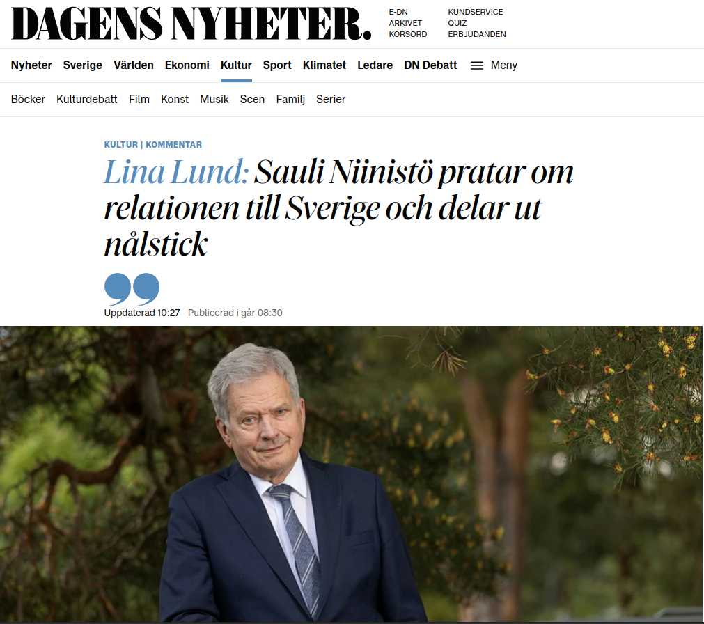 Det är ett eftertänksamt och stundtals vasst Sommarprat, som även avhandlar Niinistös möten med Vladimir Putin och hur han raserat freden i Europa. Jag hade önskat att han vågat glänta på fler dörrar till politikens inre rum, inte minst när det gäller turerna mellan Sverige och Finland under våren 2022.