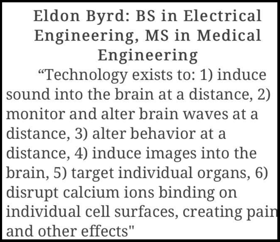 Aaron Alexis, a former Naval reservist and military contractor, heard voices in his head that he attributed to extremely low frequency EM prior to killing 12 people in Naval Sea Systems Command at Washington Navy Yard.