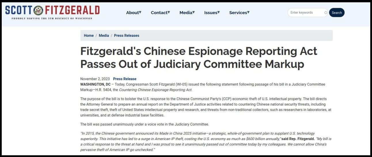"Den 2 november har lagen h. R. 5404, Countering Chinese Espionage Act föreslagen av den amerikanska kongressledamoten Scott Fitzgerald (vi-05). antogs av den amerikanska rättskommittén, med en röst för 24-0.