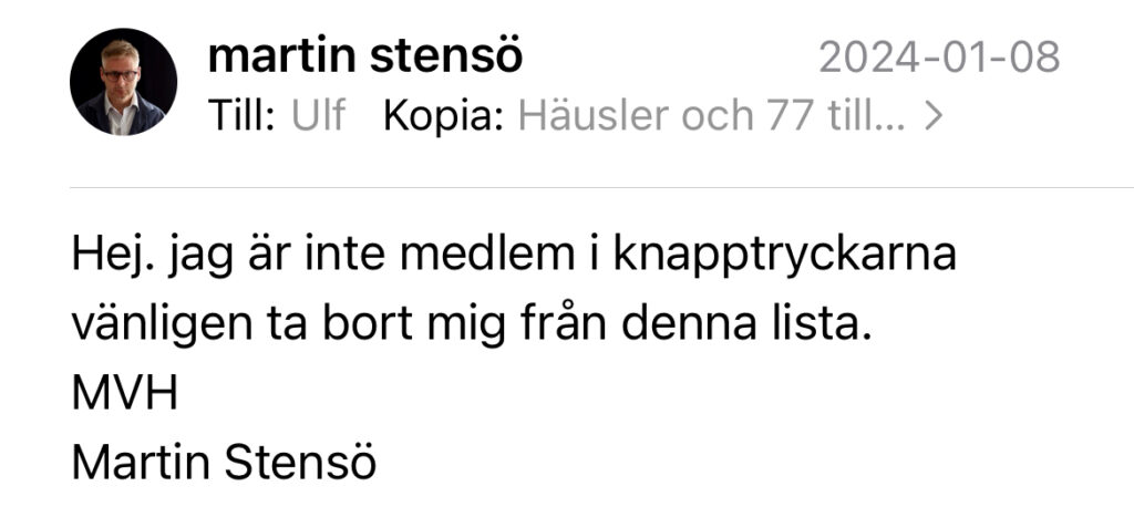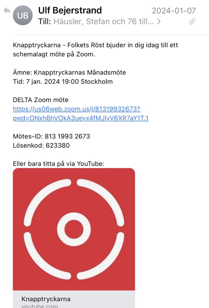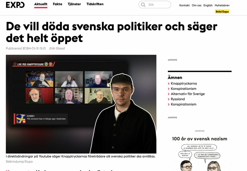 Expos artikel: "Samlingen består av fem män och en kvinna. De sitter i sina respektive hem och sänder live på Youtube. Det är en extrainsatt sändning som hålls för att prata om dagsaktuella politiska frågor. Bilden pryds av Knapptryckarnas logotyp och en text: ”Live med Knapptryckare”. Partiet fick just sina första kommunala mandat då sju SD-politiker i Forshaga skiftat partibeteckning. Den ideologiska grunden är ett kraftigt konspirationstroende och en slags hemmasnickrad form av direktdemokrati där de invalda är bundna att rösta som partiets medlemmar vill. Politikerna ska alltså bli knapptryckare. Med i sändningen är det konspirationistiska partiets ledare Ulf Bejerstrand och medlemmarna Marie Jakobsson, Öystein Rönne och Håkan Bergmark. Förutom dessa medverkar också AFS-aktivisten och partiets företrädare i kyrkomötet Lennart Matikainen och den tidigare sverigedemokratiska kyrkopolitikern Thomas Gjutarenäfve, mer känd som Damp-Janne i komediserien Leif och Billy på SVT. Samtliga har gjort sig mer eller mindre kända inom konspirationistiska och högerextrema kretsar genom sina Youtubekanaler där de sprider konspirationsteorier, fientlighet mot demokratiska institutioner och rasism. I den här sändningen ska de bland annat prata om Natoprocessen och den svenska stridsviljan. De är, föga förvånande givet den politiska miljö de verkar i, mycket kritiska till att Ryssland skulle utgöra något som helst hot mot Sveriges säkerhet. Knapptryckarnas partiledare, Ulf Bejerstrand, var under senare delen av 2010-talet notorisk förintelseförnekare och har sin politiska bakgrund i bland annat Ny Demokrati. Nu är han så upprörd över regeringens varningar för ett ökat krigshot i Sverige att han önskar livet ur försvarsminister Pål Jonsson. Sedan uppmanar han svenska folket att beväpna sig. – Alla borde beväpna sig för att möta Putin, men på väg till Ryssland kan man ju passera riksdagen också, säger Bejerstrand ackompanjerad av skratt från övriga paneldeltagare. I samma anda fortsätter samtalet. Politiker ska dö. Spärra in dem. Spräng dem i bitar. Samtalet genomsyras fullständigt av längtan till väpnad kamp och önskningar om att svenska riksdagsledamöter och regeringsmedlemmar ska skjutas ihjäl. – De är äckliga, de är psykopater, de är sinnessjuka. De borde egentligen avrättas allihop. Jag brukar säga det – återupprätta galgbacken i Gamla stan så får vi det här blodbadet, säger knapptryckaren Öystein Rönne och får ett leende och en tumme upp av AFS-aktivisten Lennart Matikainen samtidigt som det rasslar till i kommentarsfältet. Retoriken är för en sansad människa chockerande. Men uttalandena är långt ifrån en isolerad händelse. Snarare följer de en tankelogik den konspirationistiska miljön närt sedan länge: samhället är genomruttet av korruption och ”globalisternas” dolda maktagenda och måste stoppas med alla till buds stående medel. I februari 2023 varnade Säkerhetspolisen för hotet mot vår demokrati från det som myndigheten kallar för ”anti-statliga aktörer” – alltså den konspirationstroende politiska miljö som växte sig allt starkare under och i spåren av coronapandemin. En del av miljön skildras också i Totalförsvarets forskningsinstituts rapport Rutten demokrati i vilken Knapptryckarna nämns i ett kortare stycke som en av aktörerna i den ”antidemokratiska extremistmiljön”. I helgen samlas den konspirationstroende miljön återigen tillsammans med delar av den svenska extremhögern för en så kallad ”Kärleksmanifestation”. Den här gången ska man ”ta tillbaka SR och SVT”. För dem är public service en indoktrineringscentral som förgiftar befolkningen med ”människofientliga ideologier”, som det uttrycks på manifestationens sajt. De skriver att personalen består av ”extremister som går den internationella finanselitens ärenden”. Och ska man tro Knapptryckarnas ledare Ulf Bejerstrand blir det, åtminstone i framtiden om SVT fortsätter ”pumpa ut lögner”, ett våldsamt övertagande av public service vi kommer få se. Precis som det han fått berättat för sig av en ungersk åsiktsfrände. – Först var det snällt, sen gick det våldsamt till och slutade med att man sprängde dörrarna, rusade in och slängde ut alla därifrån och övertog tv och radio. Det är inget jag uppmanar till men det kan mycket väl bli så, fantiserar han i en av sina livesändingar. Erik Glaad"