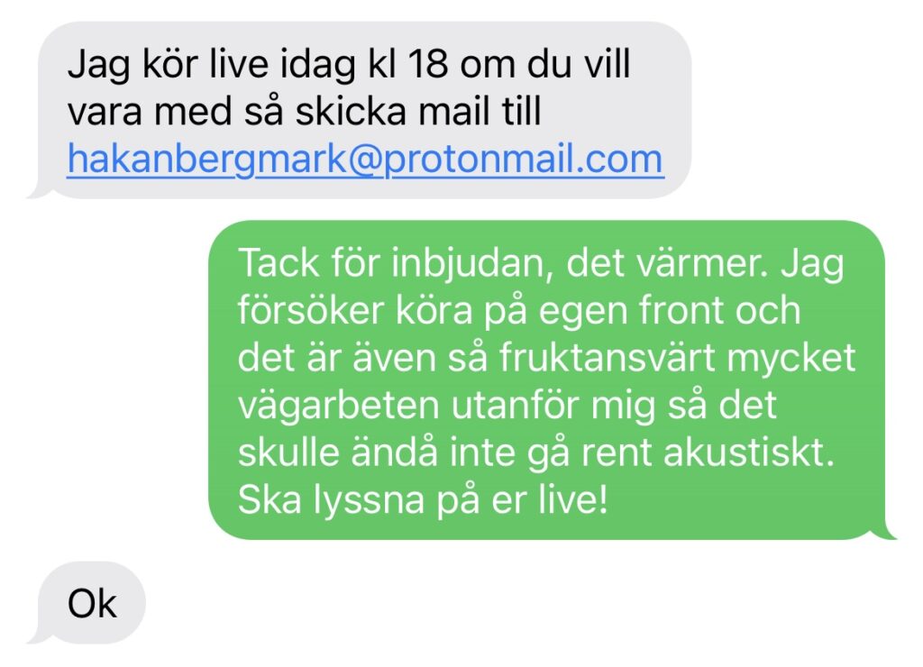 Den här livesändningen försökte både Ulf Bejerstrand och Håkan Bergmark att bjuda in mig till. Märkligt.. ..och vilken tur att jag tackade nej.