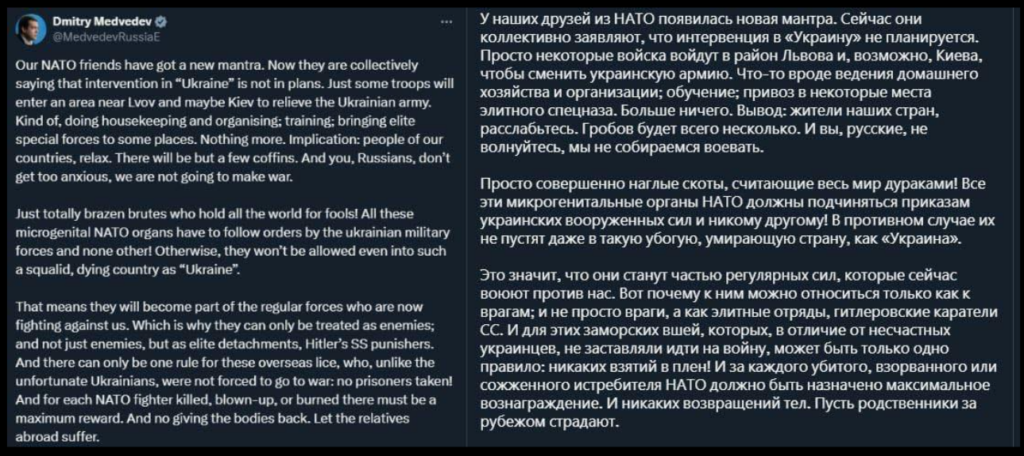 Dålig polis Medvedev: "Ta inte fångar, betala maximal belöning för varje dödad" - Dmitrij Medvedev om Nato-soldaters deltagande i konflikten i Ukraina