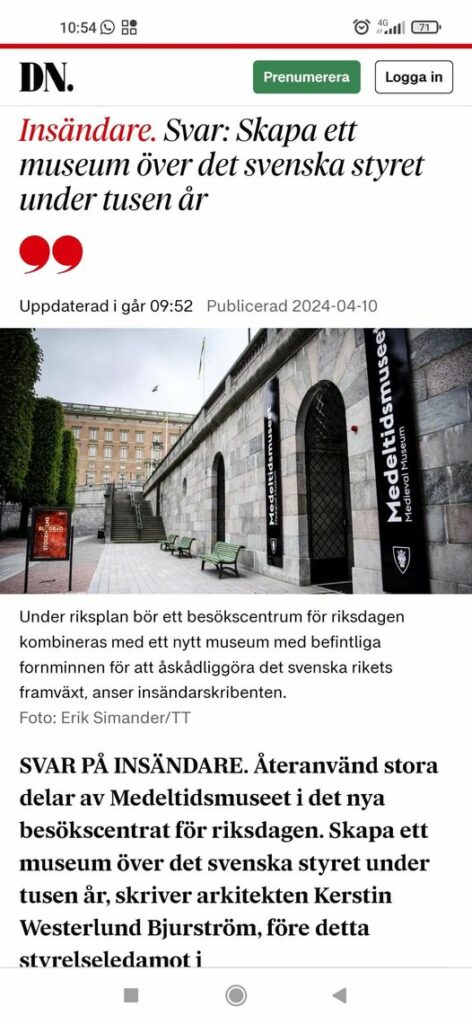 Stockholms stads ”nej tack” var en missräkning för många. Men det ger i gengäld bättre utrymme för riksdagen att i linje med sitt uppdrag och med avstamp från fornfynden och befintlig gestaltning av medeltida företeelser och liv, utveckla ett museum med iscensättning av det svenska styrets väg till demokrati. Att med hjälp av anpassade besökstider och varierande ljussättning kunna använda detta som både besökscenter och museum vore i dagsläget inget konstigt, om det inte finns plats nog att separera dessa funktioner.