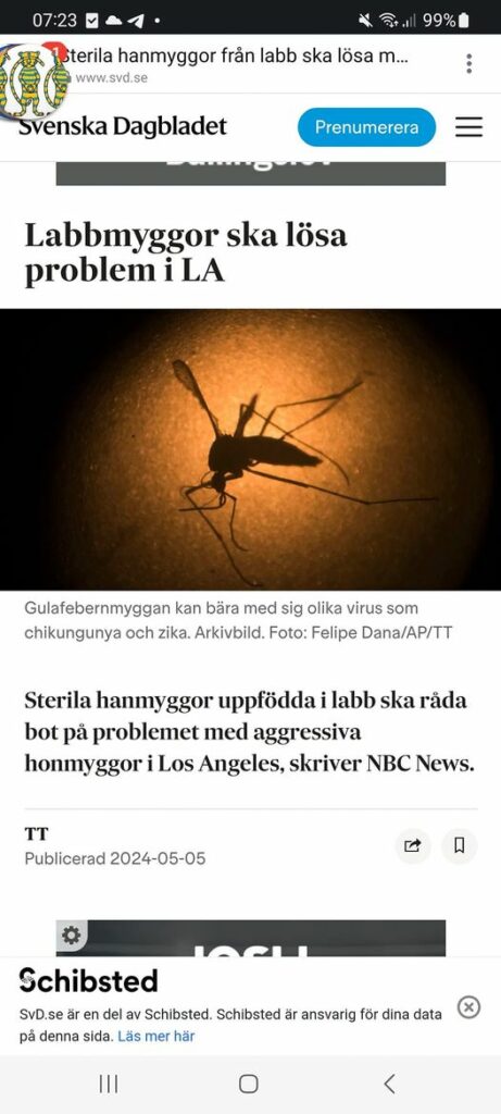 Den lokala hälsomyndigheten lanserade i veckan ett pilotprojekt för att få bukt med myggorna och släppte ut 20 000 sterila hanmyggor som bestrålats i labb. Förhoppningen är att de ska para sig med honorna – och resultera i värdelösa ägg.