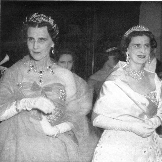 Queen Olga of Yugoslavia, wearing her grandmother's ruby tiara, alongside her sister, Marina, Duchess of Kent, photo early 1960s.